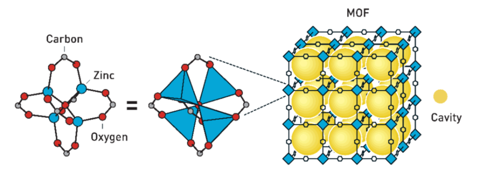 Invensi monumental Prof. Yaghi adalah penemuan struktur MOF-5 (Zn₄O(BDC)₃) seperti pada Gambar 2, yang memanfaatkan Secondary Building Units (SBU) berupa gugus logam Zn₄O dan ligan benzenedikarboksilat (BDC) sebagai penghubung organik. Struktur ini membentuk jaringan kristalin stabil dengan pori besar dan luas permukaan mencapai 2.900 m² per gram, menjadikannya salah satu material paling berpori yang pernah dibuat. Gambar 2 dari Scientific Background to the Nobel Prize in Chemistry 2025 (The Royal Swedish Academy of Sciences) menggambarkan kerangka MOF-5 dengan ruang berpori besar (berwarna kuning) yang menjadi simbol revolusi dalam penyimpanan gas, katalisis, dan pemurnian udara.