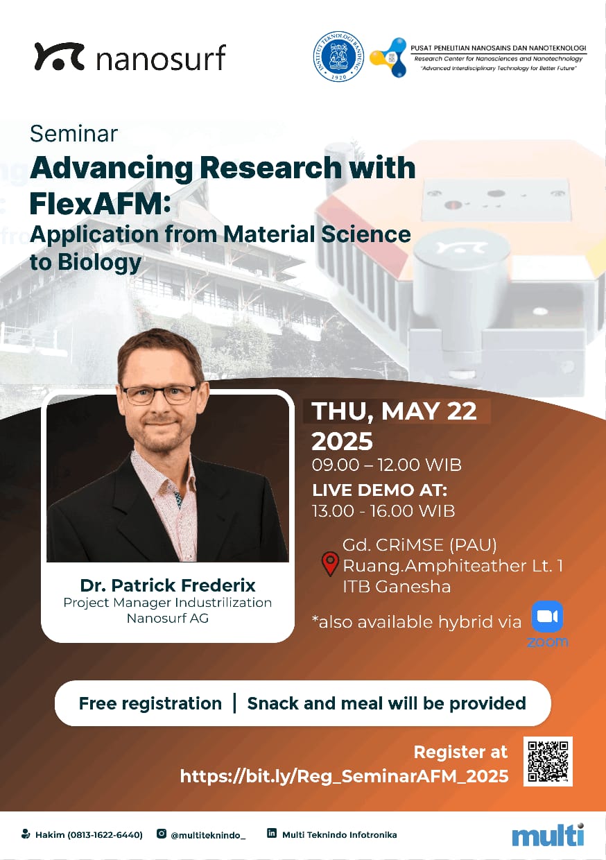 Kegiatan ini bertujuan untuk mensosialisasikan kegunaan peralatan FlexAFM milik PPNN ITB untuk memperkaya penelitian lintas bidang, khususnya di bidang ilmu material dan biologi. FlexAFM adalah mikroskop gaya atom (atomic force microscope) produksi Nanosurf AG dengan fleksibilitas tinggi yang memungkinkannya digunakan untuk penelitian berbagai macam sampel termasuk sampel yang sensitif seperti sampel biologis.